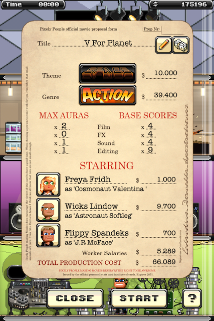 Así que, una vez escogido el género, temática, título y protagonistas, tendremos que conseguir el mayor número de puntos, para ello tendremos que jugar con los multiplicadores de cada planta y los estados de nuestros trabajadores.